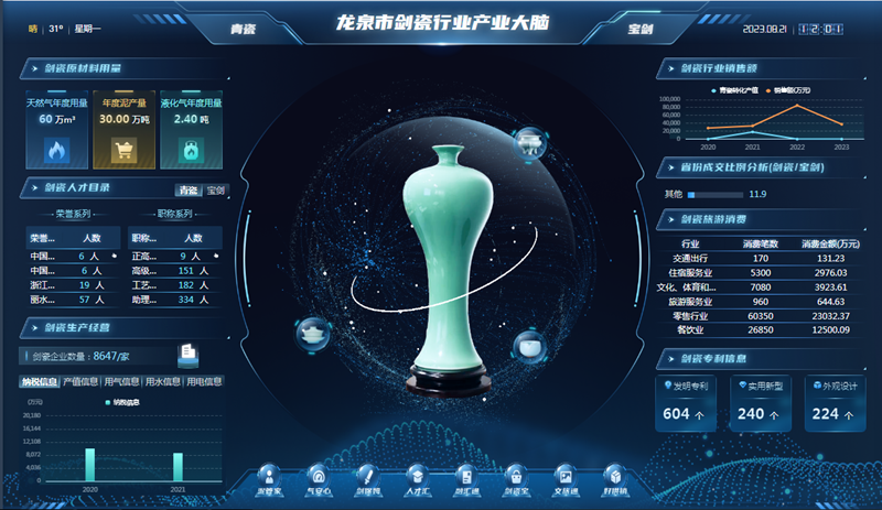 “剑瓷产业大脑”应用场景的产生,是龙泉市深化省委巡视整改,推动剑瓷文化产业创新发展的重要举措之一。“剑瓷产业大脑”包含“泥管家、气安心、好供销、人才汇、融汇通、剑瓷宝、剑保姆、文旅通”等八大场景,分别在浙里办、浙政钉、微信小程序等端口上线,实现政府、企业、从业人员三方共享、共通资源。