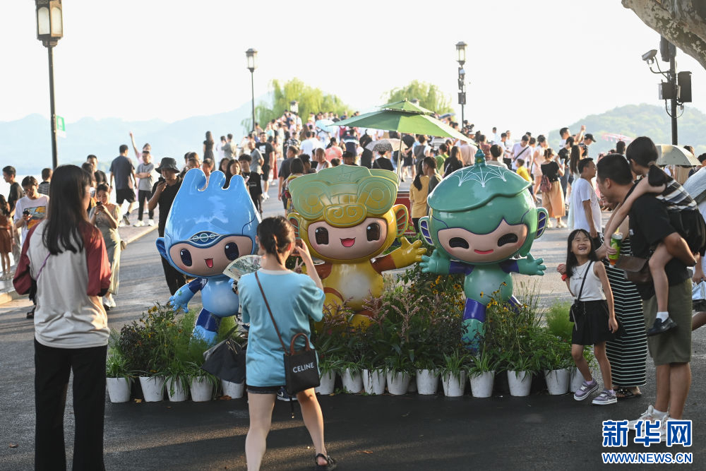 游客在位于杭州西湖景区的断桥边与杭州亚运会吉祥物合影(2023年8月21日摄)。新华社记者 黄宗治 摄