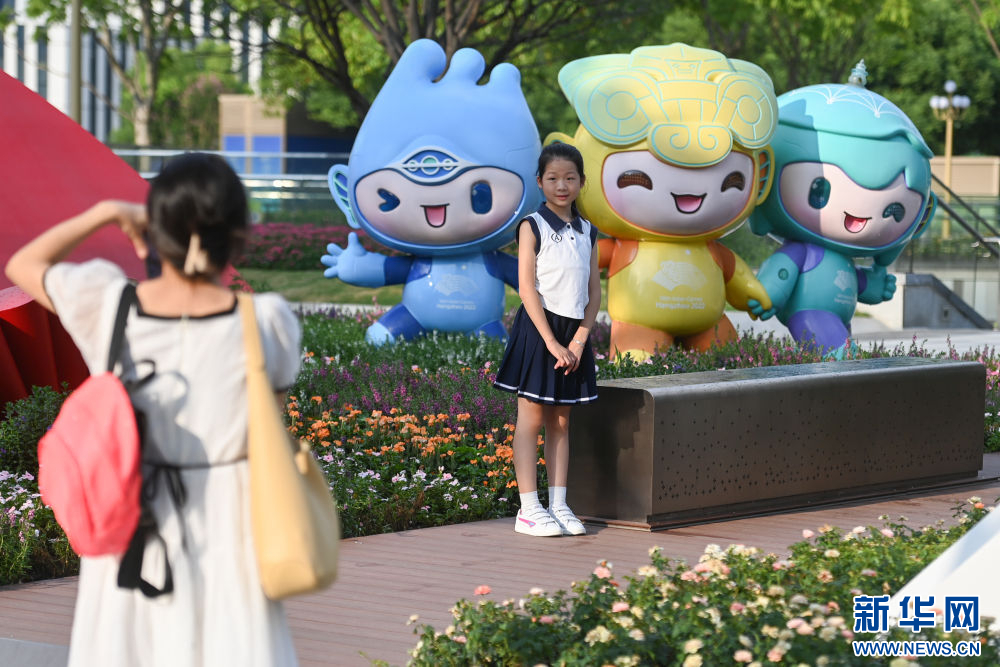 小朋友在位于杭州市拱墅区的武林广场与杭州亚运会吉祥物合影(2023年8月21日摄)。新华社记者 黄宗治 摄