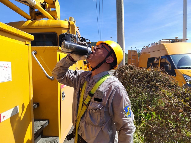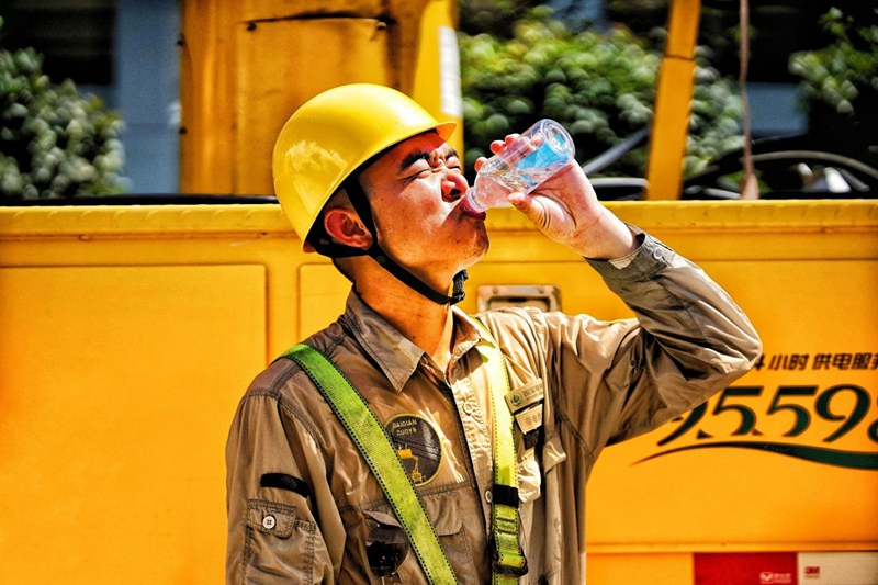 7月17日,图盛集团平阳昌泰公司带电作业员工在完成作业任务后,喝水时被热辣的太阳晒得睁不开眼。丁晨 摄