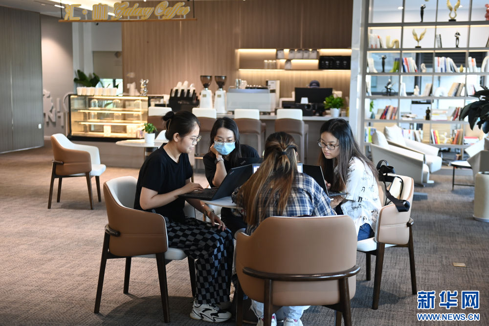 一家入驻企业的员工在杭州市拱墅区长庆街道汇金国际商务社区的公共空间讨论(8月16日摄)。新华社记者 黄宗治 摄