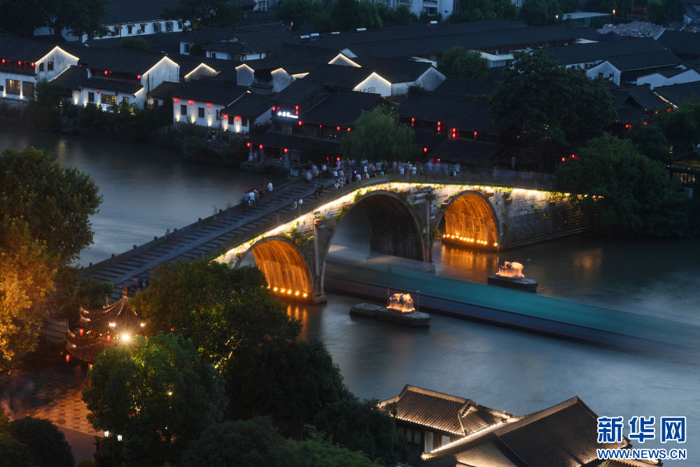 货船经过位于杭州市拱墅区的京杭大运河拱宸桥(2017年7月20日摄)。新华社记者 黄宗治 摄