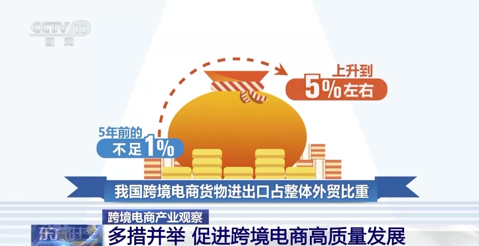 如今,我国跨境电商货物进出口占整体外贸比重由5年前的不足1%上升到5%左右。我国跨境电商主体已超10万家,进出口额1亿元以上的约7800家。