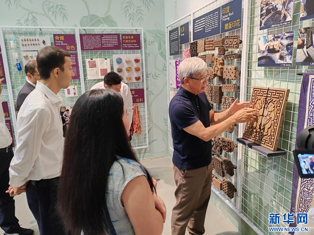 9月1日下午,赵丰教授向参观“五彩亚细亚:亚洲服饰展”的外国文博同行介绍不同国家的印染技术。新华社记者 冯源 摄