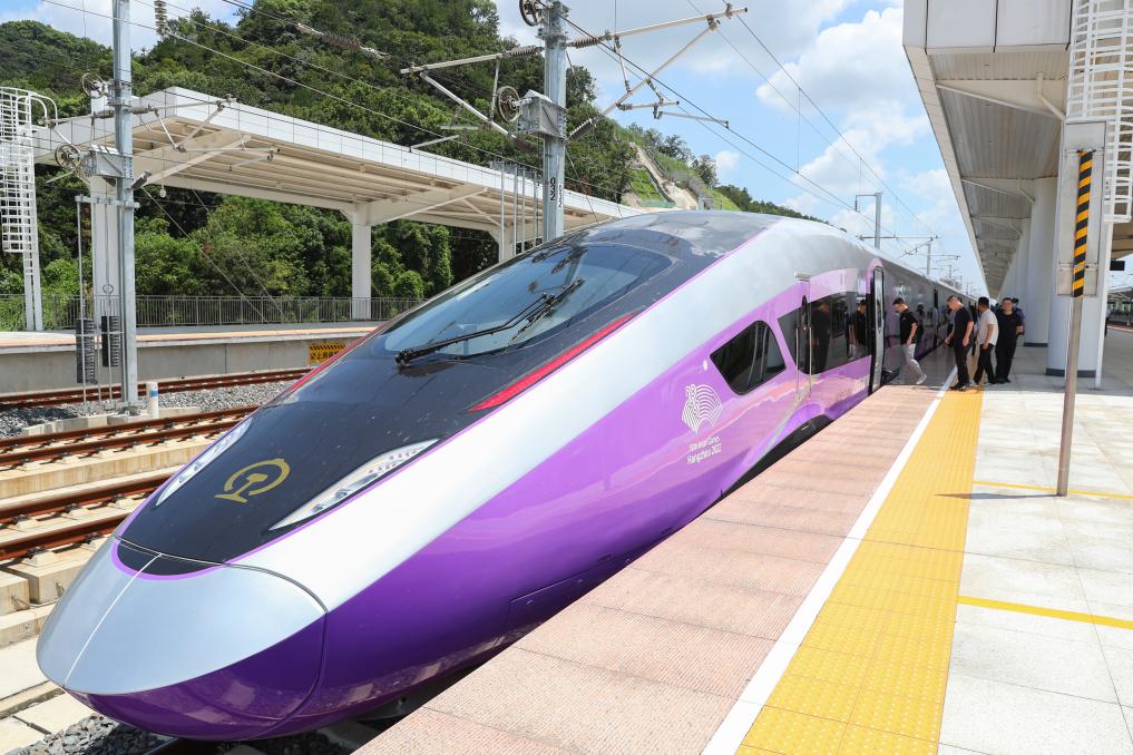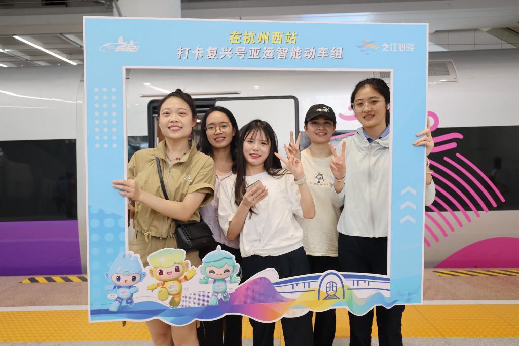 8月4日,在杭州西站,乘客在复兴号亚运智能动车组列车旁合影留念。新华社发(谢尚国摄)