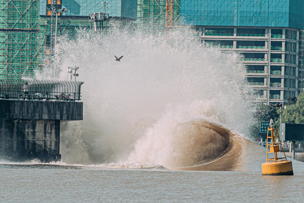 2021年9月23日,钱塘江潮水冲击堤坝形成巨浪。新华社记者 江汉 摄