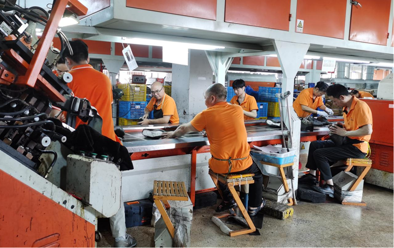 德赛鞋业有限公司生产车间内,工人们配合默契、有序作业,各条生产线飞速运转,鞋品不断下线。