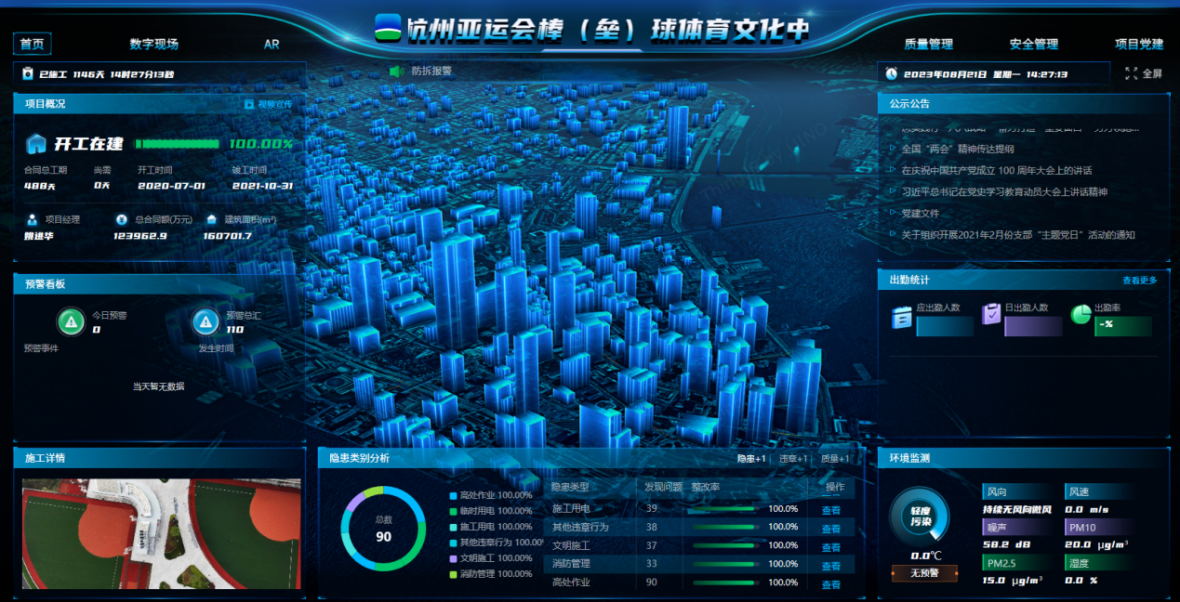 精工钢构项目部充分运用智慧工地系统,为项目现场工程管理提供了先进技术手段,实现对人、机、料、法、环的全方位实时监控,变被动“监督”为主动“监控”,在技术层面保障工期。场馆的建设过程借助BIM平台实时进行预制构件的跟踪管理,选择适宜的绿色建材,加快建造速度。模块化、标准化构件不仅提升了设计效率,而且保证施工场地的供货需求量。这为体育建筑中的大量应用预制构件起到重要的示范作用。通过黑科技的加成,项目部团队克服了工期、物流、人工紧张等问题,节约了大量人力、物力、财力,将不可能变成了可能。