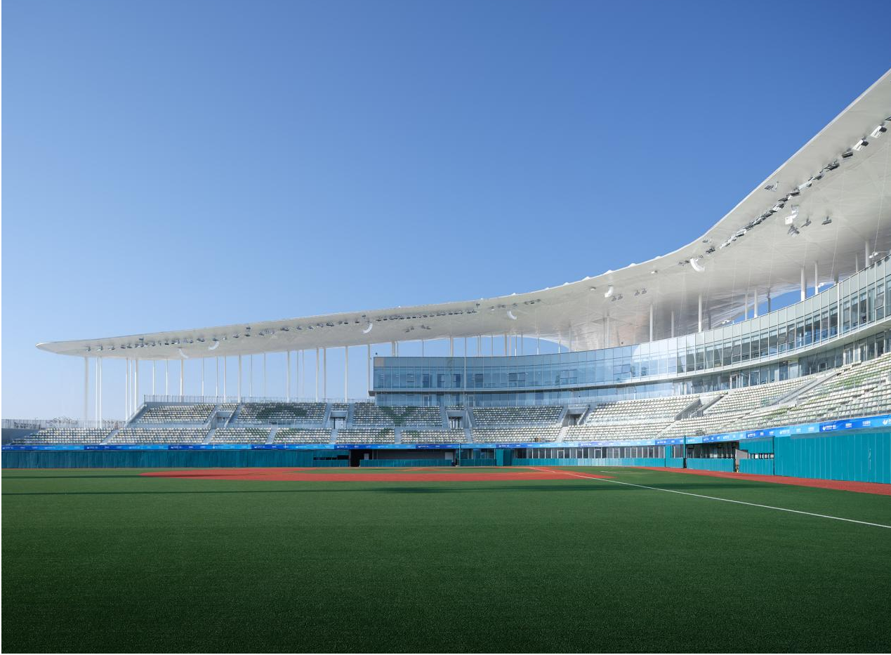 杭州亚运会棒(垒)球场馆还实现了绿色低碳产品和技术集成应用的突破。如棒(垒)球场馆三片罩棚采用双向桁架钢结构,投影面积达到21000㎡,钢结构部品部件采用工厂预制,可实现现场快速拼装。罩棚屋面采用功能装饰一体化PTFE(聚四氟乙烯)罩棚膜,其具有独特的光学性能,透光率13%,对热能反射率73%,白天入射光线成为自然温射光,能够防止内部装饰材料和设备的褪色;夜间高反射性能获得卓越的照明效果,减少电能消耗。涂覆于膜防护基材的纳米二氧化钛光催化保护薄膜,坚固耐用,能有效杀灭多种细菌,并能将细菌或真菌释放出的毒素分解及无害化处理;同时还具备除甲醛、除臭、杀菌、自洁抗污、净化空气等功能,能够大大降低日后运营围护成本。