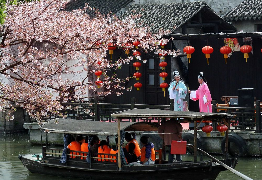 ↑游客乘坐游船在西塘古镇观赏岸边的越剧演出。