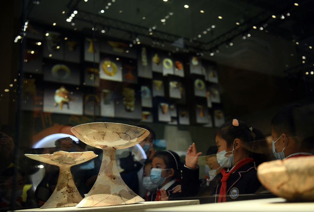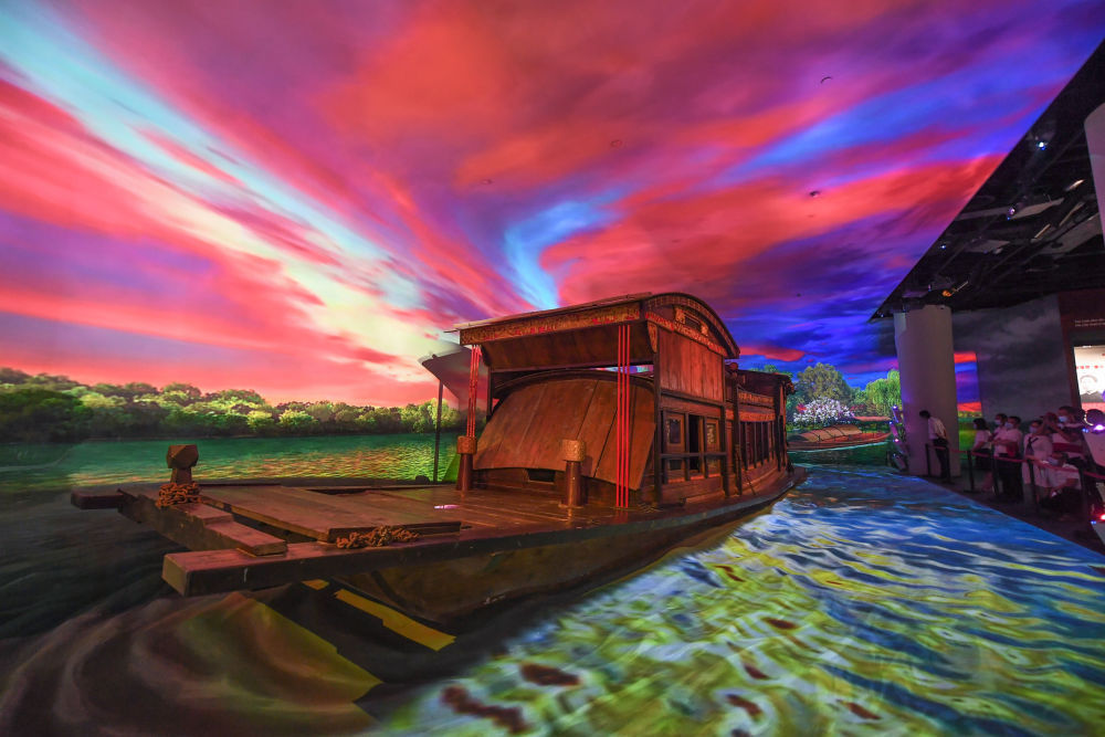 ↑游客在南湖革命纪念馆内参观红船模型及多媒体场景重现。