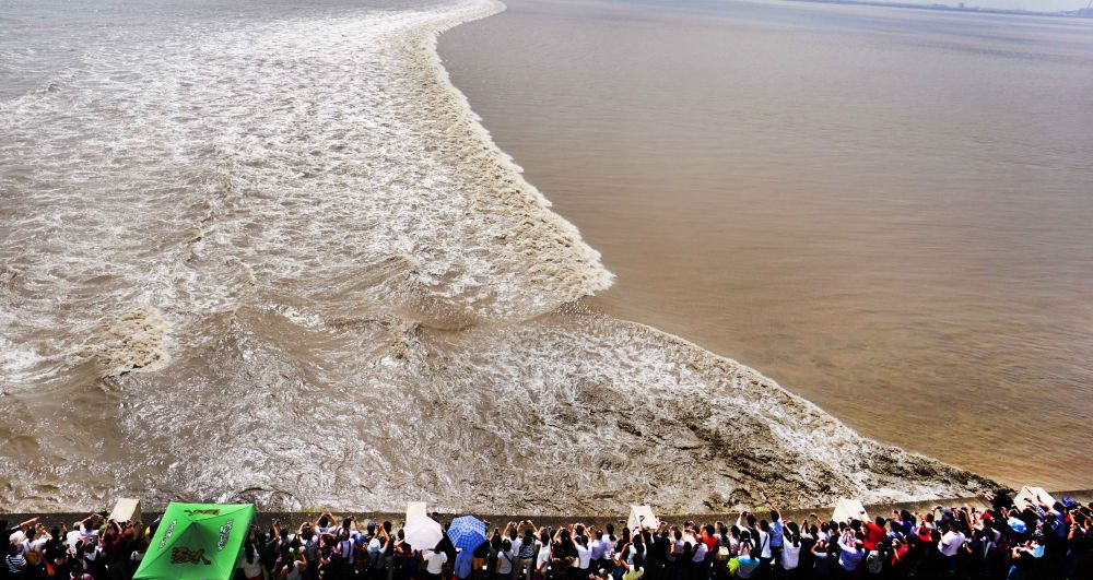 ↑游客在海宁市盐官旅游度假景区内的钱塘江畔观看壮观的一线潮。