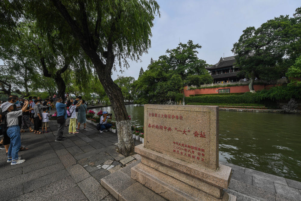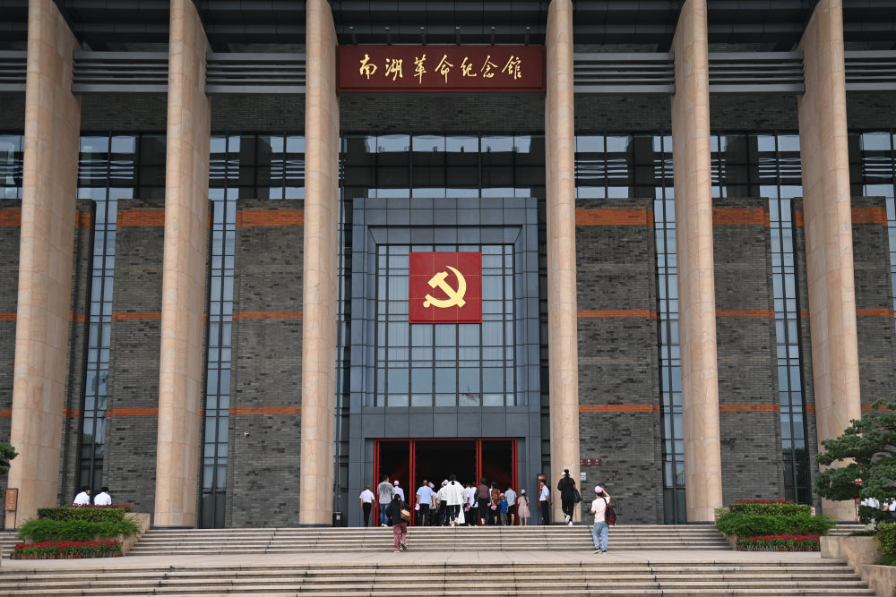 ↑这是嘉兴火车站1921复建站房。乘坐火车抵达嘉兴站的游客可由此步行,沿着新时代“重走一大路”红色旅游路线前往南湖旅游区。