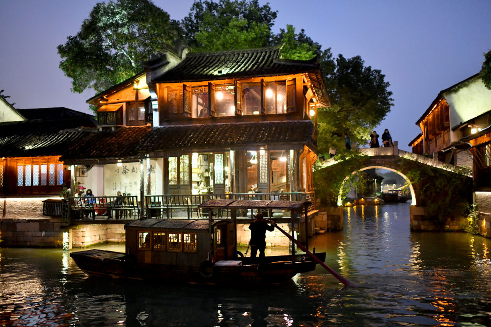 ↑游客乘船在浙江嘉兴桐乡市濮院镇的濮院时尚古镇游览。
