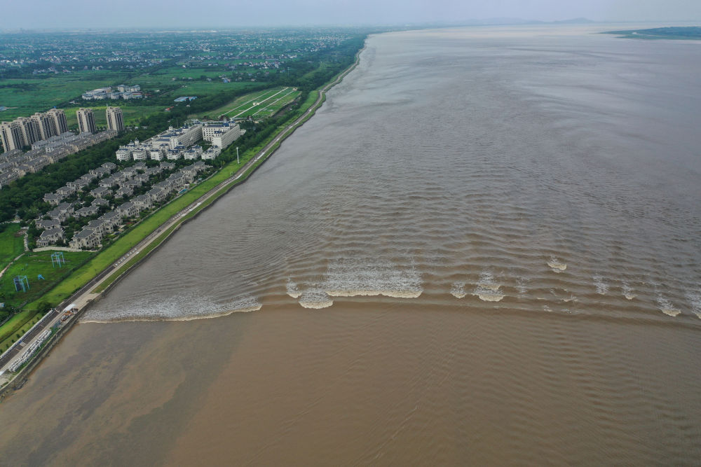 ↑2023年8月4日拍摄的钱塘江大潮“一线潮”奇观(无人机照片)。