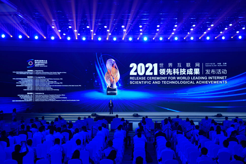 ↑时任华为轮值CEO的徐直军在2017年世界互联网大会上介绍华为3GPP 5G科技成果。