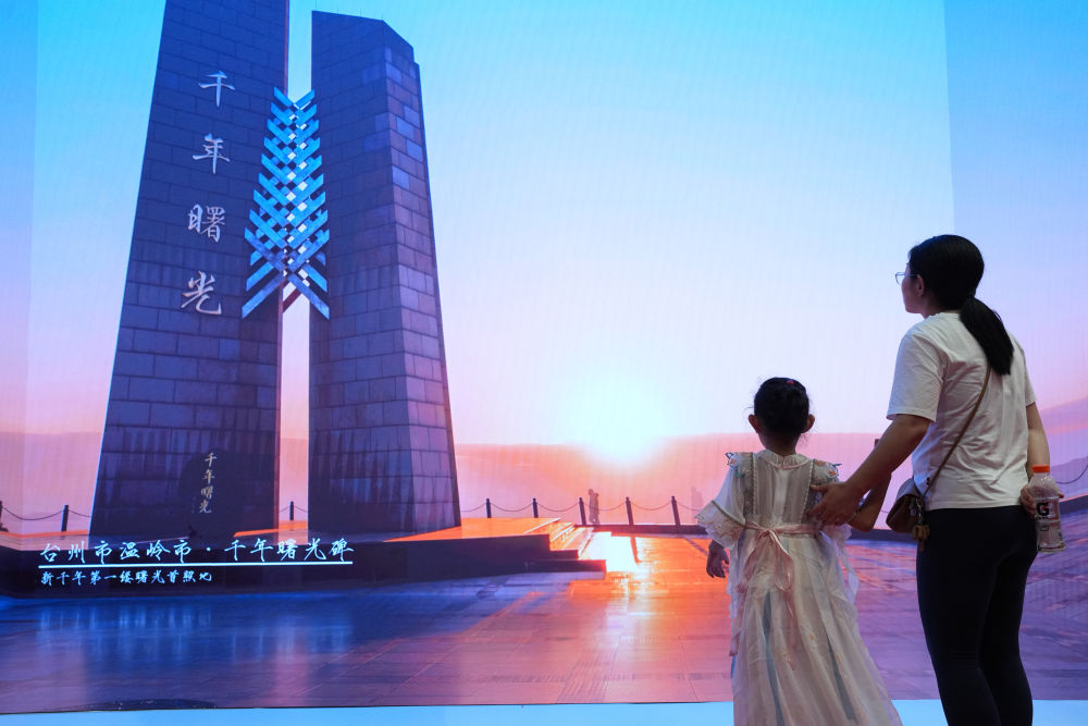 一对母女在杭州举行的大道之行——“八八战略”实施20周年大型主题展览上观看展示浙江建设成就的视频(2023年9月9日摄)。新华社记者 翁忻旸 摄