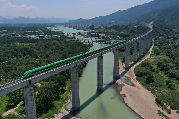 列车行驶在金台铁路仙居县境内的永安溪特大桥上(2021年6月25日摄,无人机照片)。新华社记者 黄宗治 摄