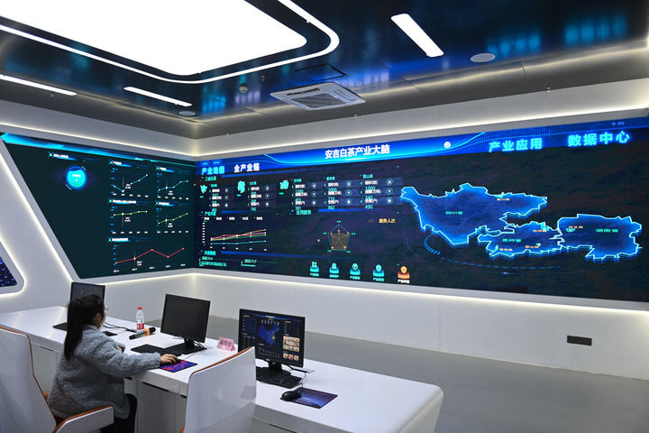 浙江安吉白茶“产业大脑”显示黄杜村捐赠种植在贵州、湖南、四川等3省5县茶苗的分布情况(2023年2月21日摄)。新华社记者 黄宗治 摄