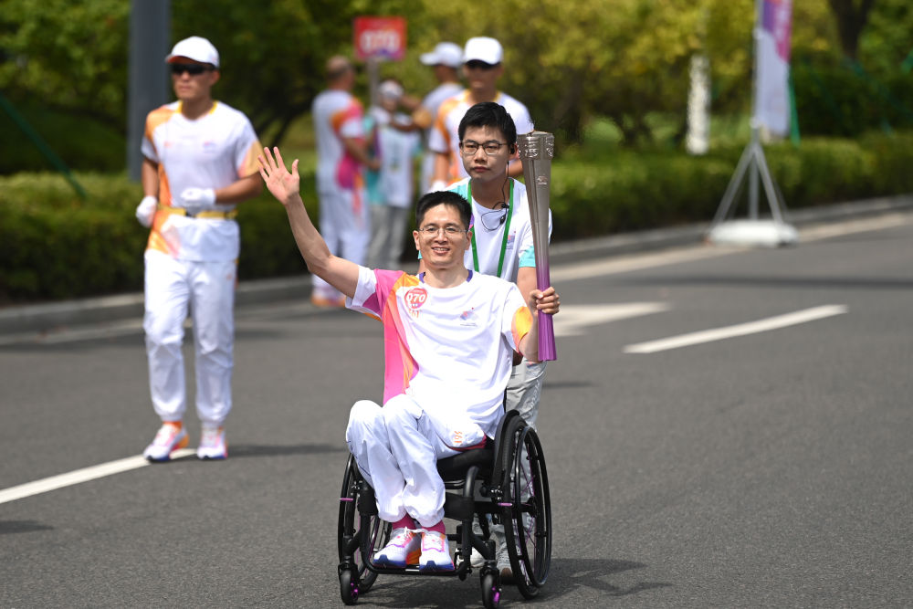 范丙是当天火炬传递的第70棒,也是杭州亚运会2022名火炬手中的一员。作为参加杭州亚运会火炬传递为数不多的残障人士之一,他坐着轮椅完成了火炬传递。