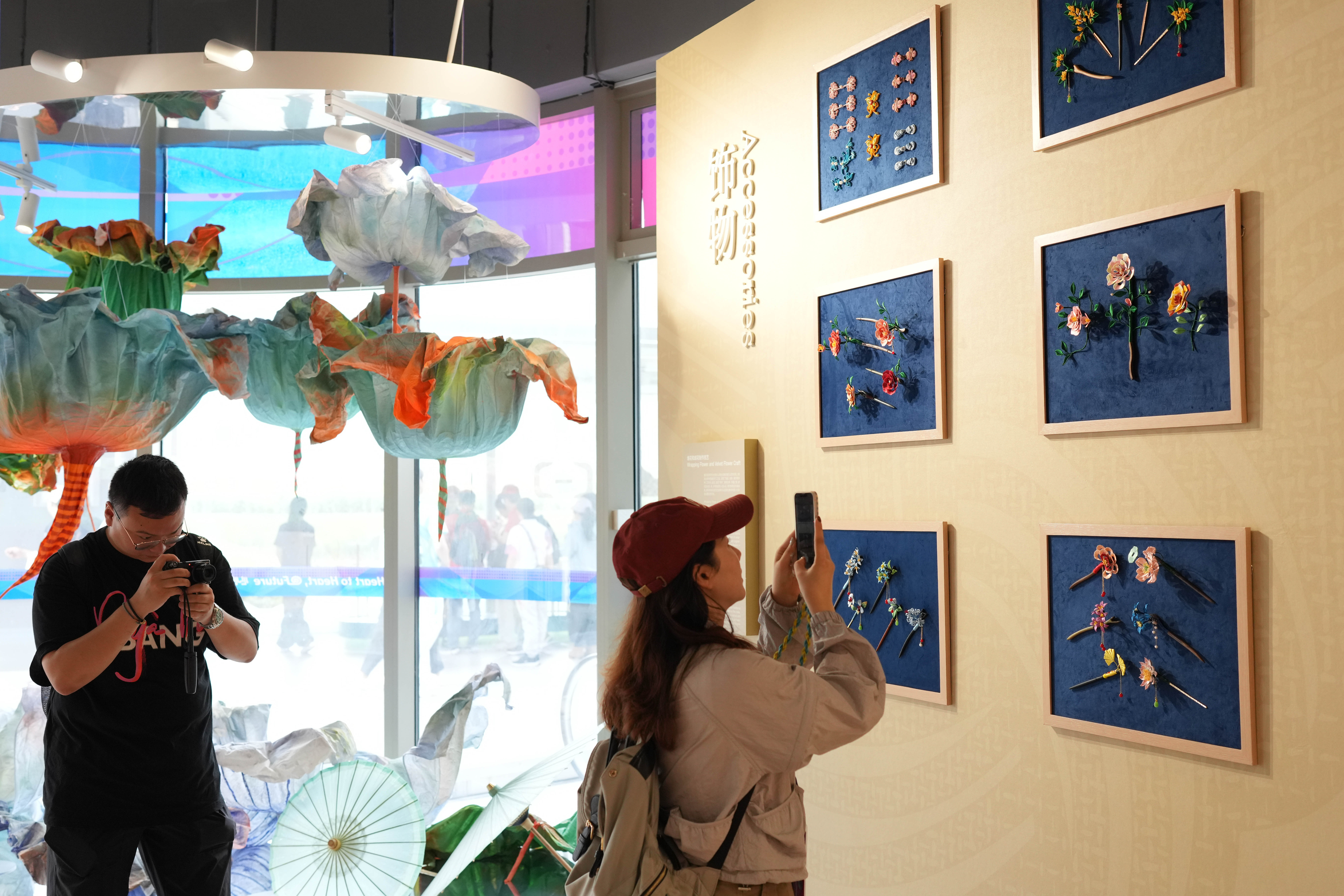 9月12日,媒体记者在参观亚运村内展示的江南特色的饰物。新华社记者 翁忻旸 摄
