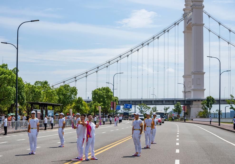 杭州第19届亚运会舟山站火炬传递专项组常务副组长李进城介绍,整个线路全程融入了海、港、船、桥等多种海洋元素,通过现代与历史的交错融合、文旅味与山海味的交相辉映,全方位展现了“海上花园城 自由贸易港”的大美场景。