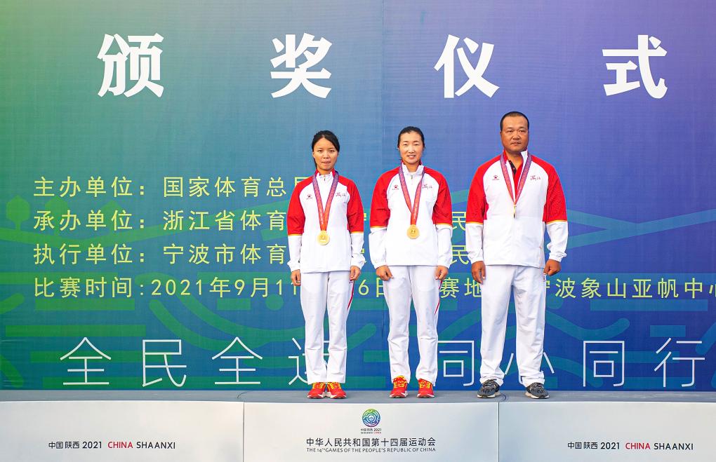 第十四届全运会女子470级场地赛颁奖仪式上,获得第一名的魏梦喜(左)、高海燕(中)与教练员合影。新华社记者 江汉 摄