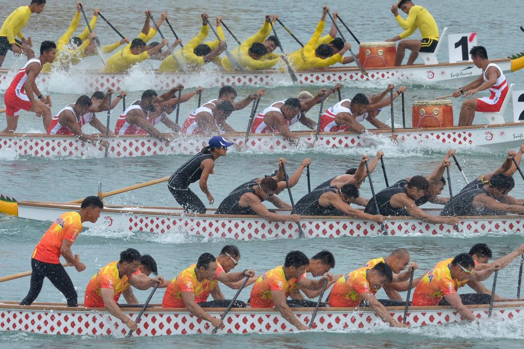 在杭州亚运会的龙舟比赛中,龙舟必须配备龙头、龙尾、鼓、舵,以此保持中国民俗传统。比赛时,每支队伍都需配有鼓手1人、舵手1人、划手10人、替补队员2人。参赛各队在各自赛道内同时起航,以龙头最前沿到达终点先后顺序决定名次。