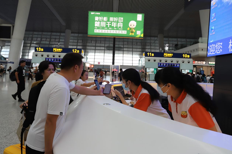 据悉,“小甜橙”们将在亚运期间,守候在杭州东站进出站口、候车室、东、西服务台、售票处、电梯口等40个服务岗点、51个自动售取票机,化身为“咨询台”“导航仪”“解说员”,用热情服务为旅客提供疑问解答、出行引导等服务。(华茂林 张飞鹏/图文)