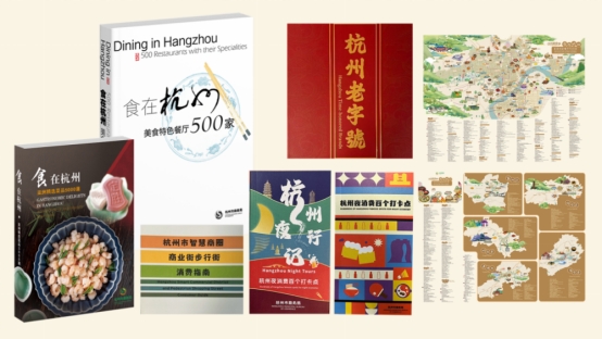 本次发布的一张地图、两本书籍以及三本手册分别包括:《食在杭州—美食特色餐厅500家》书籍和地图、《食在杭州—亚洲精选菜肴5000道》书籍、《杭州夜行记—杭州夜消费百个打卡点》手册、《杭州老字号》宣传册、《杭州市智慧商圈、特色街步行街消费指南》。
