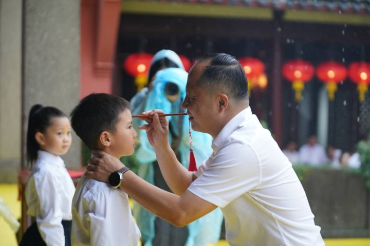 在现场,开蒙礼四项仪程依次展开。在尊师之礼环节,只见来自柯城区尼山小学的高轶涵和同学们一起整齐列队,面向孔子塑像和老师三鞠躬。随后,孔子第76代嫡长孙孔令立先生携老师、嘉宾为他们的额头点上朱砂。场上“咚、咚、咚”三声鼓声响起,每位学子被授予“崇贤有礼带”。在全体孩子齐诵《论语》节选中,开蒙礼圆满礼成。“老师告诉我们,开蒙礼就是开启智慧,很有意义。”高轶涵好奇地翻看着挂在脖子上的“崇贤有礼带”,稚嫩的脸上露出灿烂的笑容。