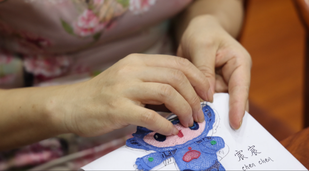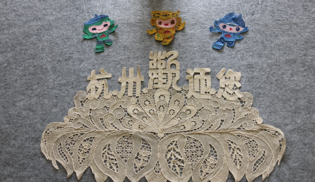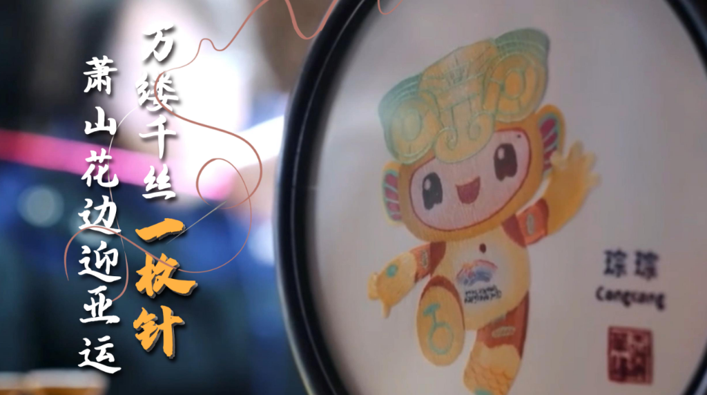 用缤纷的绣线勾勒出了萧山花边版亚运吉祥物