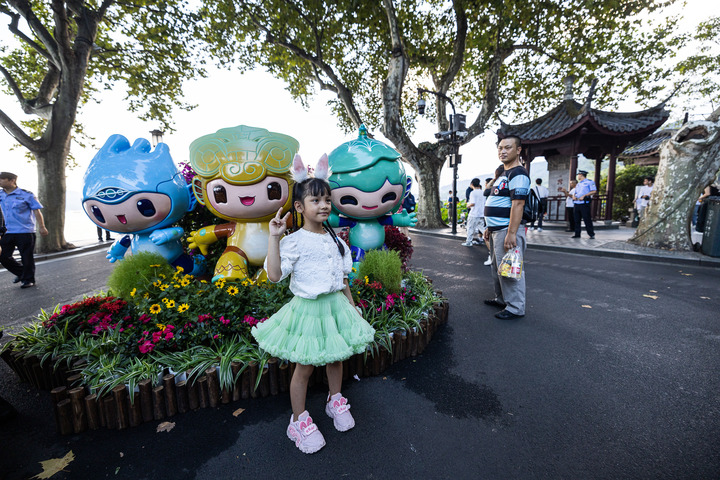 9月29日,游客与杭州西湖断桥边的亚运会吉祥物合影。新华社发 伊凡 摄