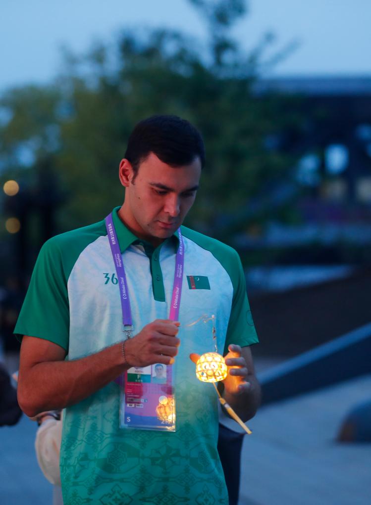 9月29日,一位土库曼斯坦运动员在亚运村查看收到的灯笼。新华社记者 胡星宇 摄