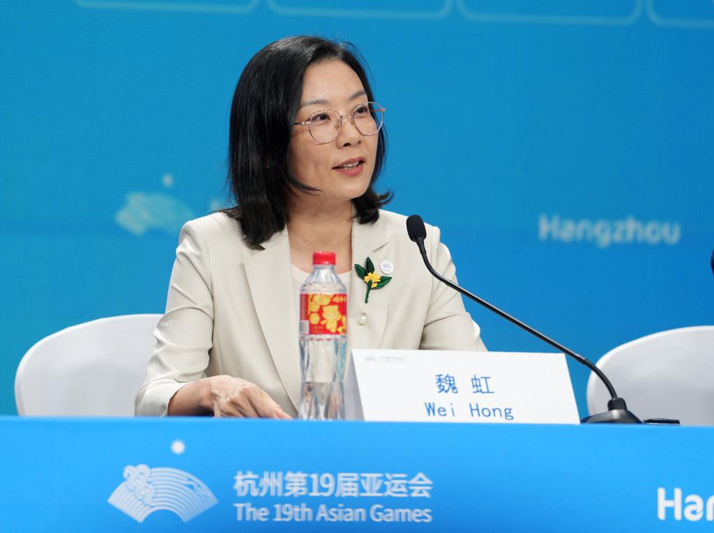 9月29日,杭州亚运会亚运村运行管理中心副指挥长魏虹在发布会上介绍有关情况。新华社记者 陈晔华 摄