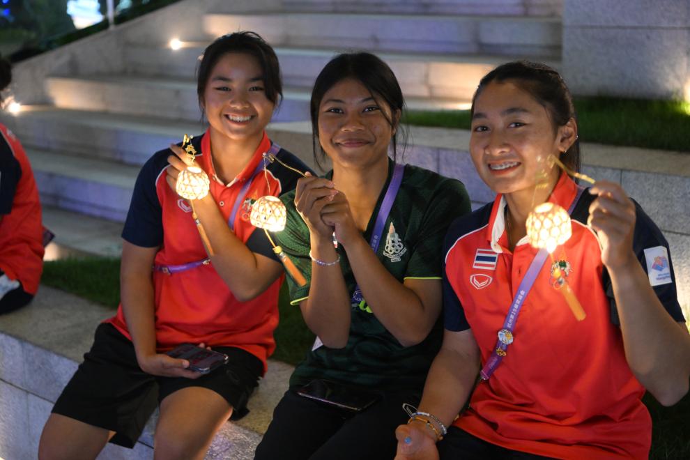9月29日,泰国运动员在亚运村手提小灯笼合影。新华社记者 徐嘉懿 摄