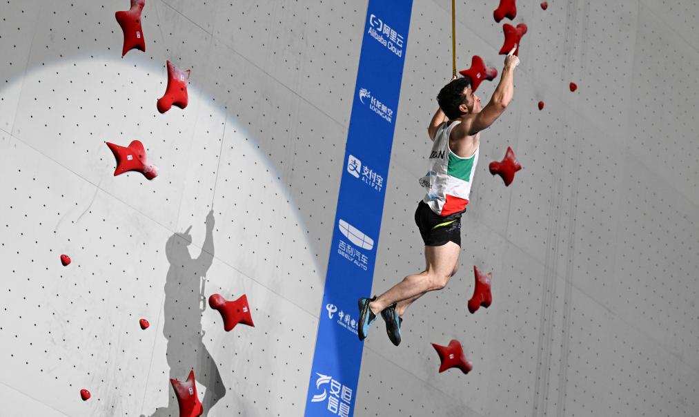 10月3日,伊朗选手礼萨·阿里·普尔·谢纳赞迪法尔德在夺冠后庆祝。新华社记者 杨冠宇 摄