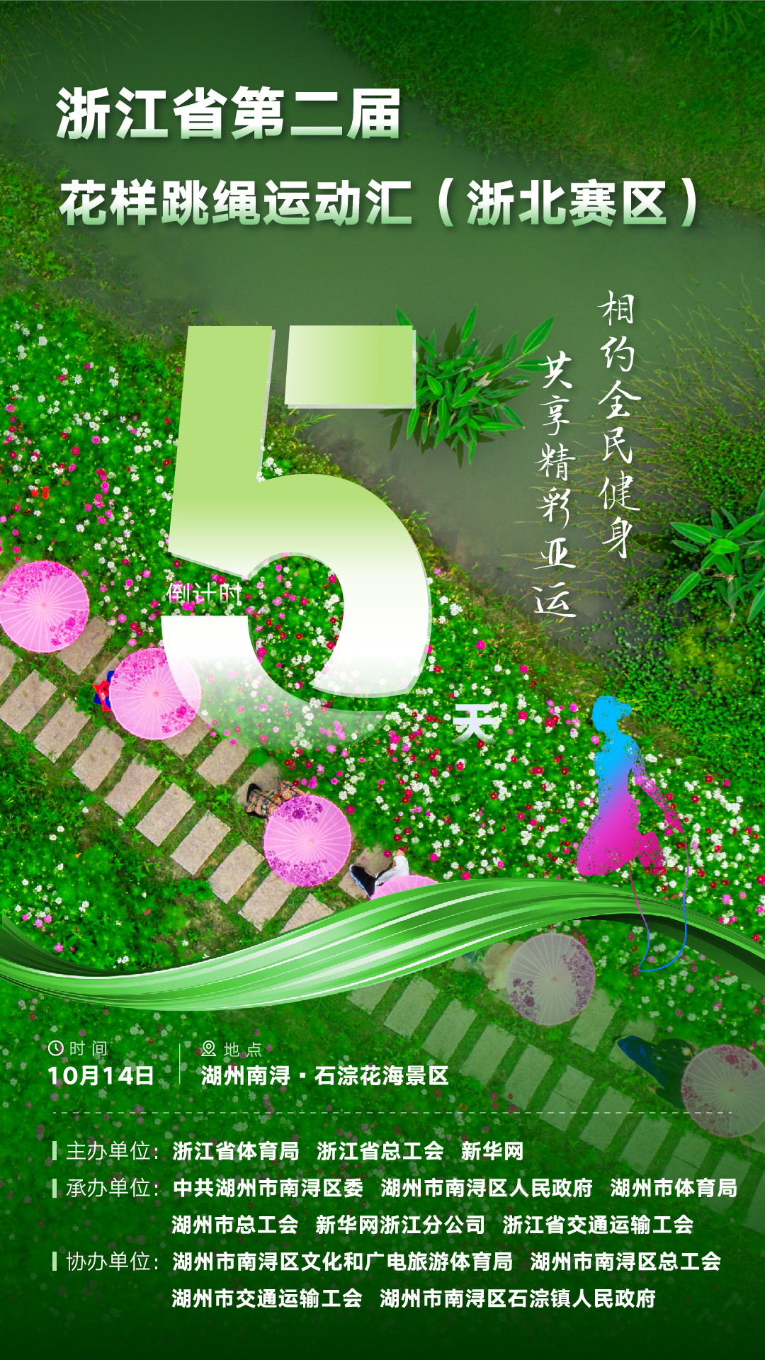 10月14日,浙江省第二届花样跳绳运动汇(浙北赛区)比赛将在浙江省湖州市南浔区石淙镇举行。倒计时5天!准备好迎接专业赛和定向游戏的双重挑战了吗?