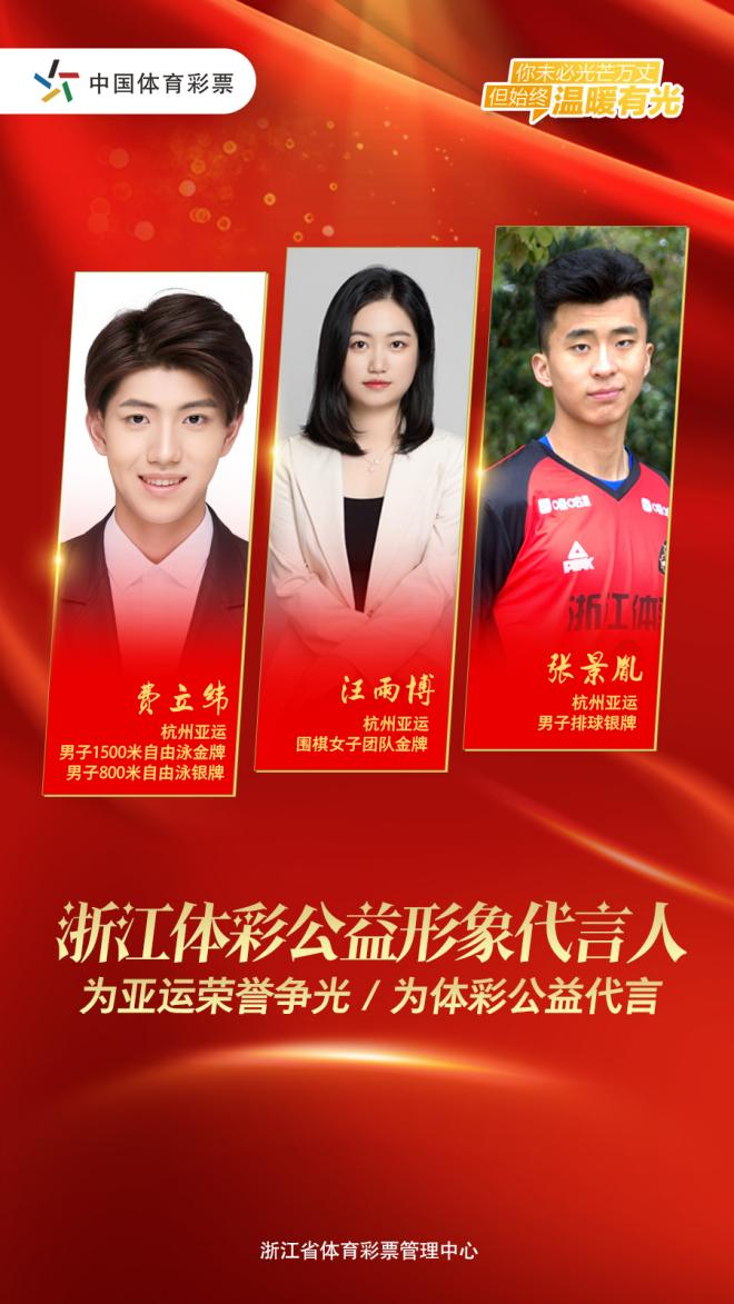 浙江体彩公益形象代言人费立纬、汪雨博、张景胤先后在亚运赛场上获得奖牌。在这些荣誉的背后有着中国体育彩票的默默付出和体彩公益金的大力支持。