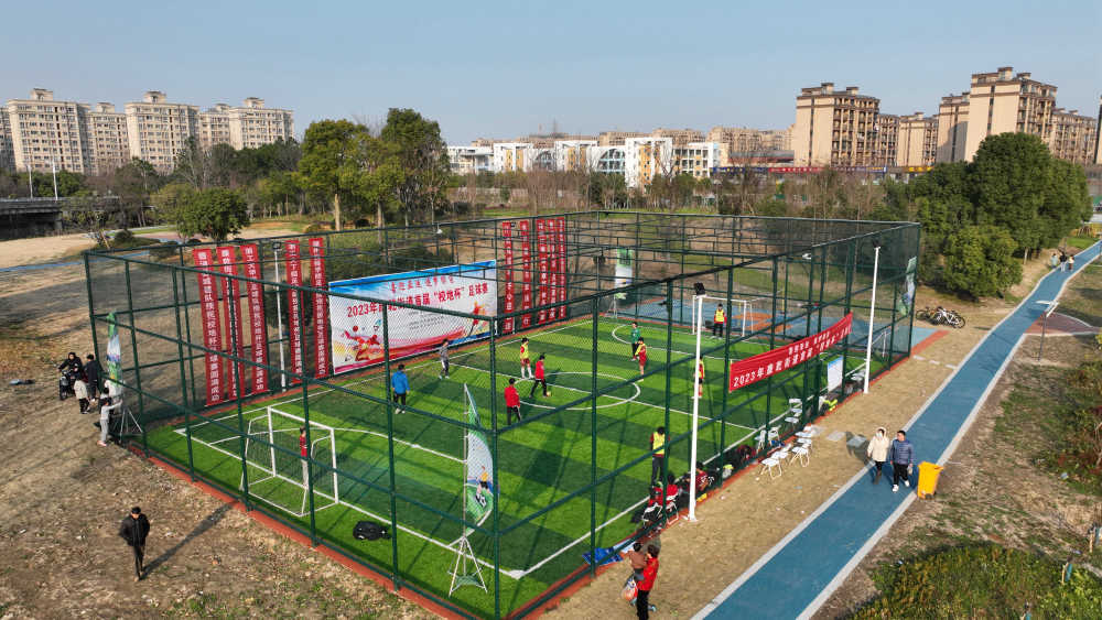 2月25日,居民在浙江省湖州市德清县康乾街道兆丰未来社区足球公园进行足球比赛(无人机照片)。湖州市德清县康乾街道盘活利用率不高的街旁闲置空间,新建一座足球场及步道、阳光草坪、健身器材、儿童游乐园等配套设施,成为辖区居民休闲健身的好去处。新华社发(谢尚国摄)