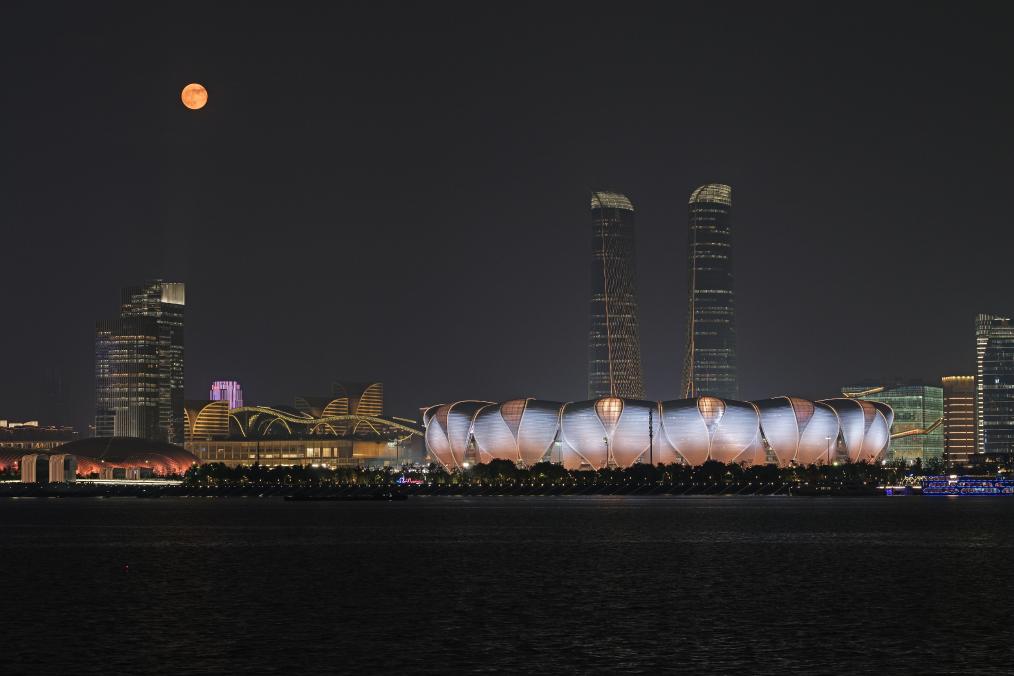 这是9月29日在杭州拍摄的杭州奥体中心体育场和满月。新华社发(李忠 摄)