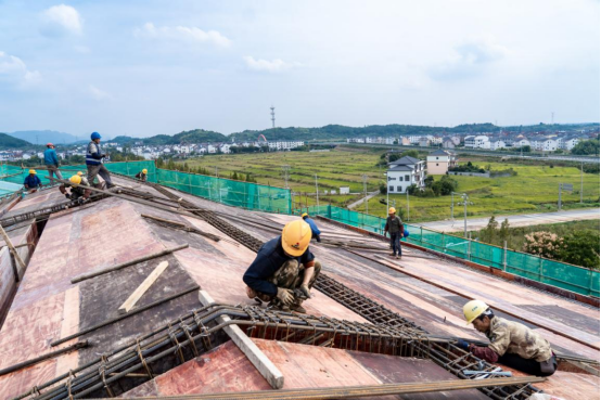 在游客中心项目现场,2台塔吊往来运输钢筋等建材,近170名工人正忙于支模板、绑扎钢筋等主体结构施工。衢州市乡村振兴发展有限公司项目负责人周健介绍,2023年2月,游客中心项目动工;10月8日,1号楼主体结构结顶,预计11月2号楼结顶。“1号楼、2号楼即将进行二次结构砌筑,年底前游客中心4栋房屋将全部结顶。”