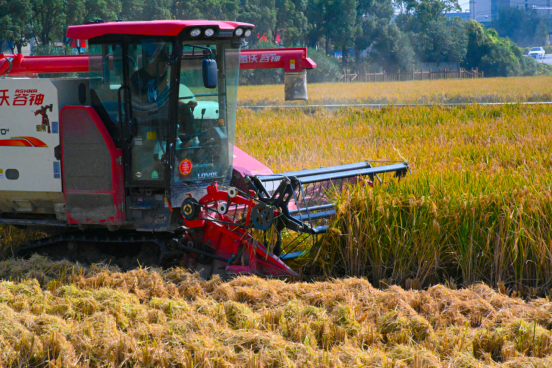10月17日,在浙江省玉环市沙门镇水稻种植基地内,轰鸣的收割机在农户的操作下,对农田里黄澄澄的水稻进行着有序收割作业。