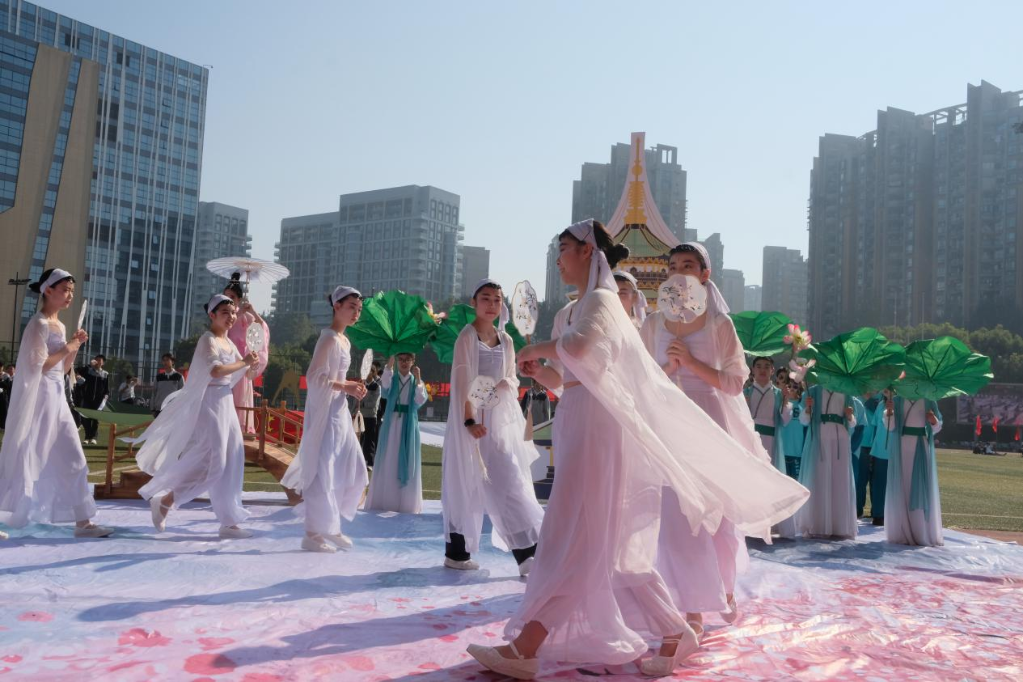 新华网杭州10月21日电 身着汉服的少年从巨型画卷中缓缓走来;西域少年千里迢迢来杭州,半为西湖半为绸;杭州河坊街巷中时不时响起叫卖声……10月19日,杭州中学的操场上响起此起彼伏的赞叹,这场以“最美是杭州”为主题的第29届校园运动会拉开序幕。