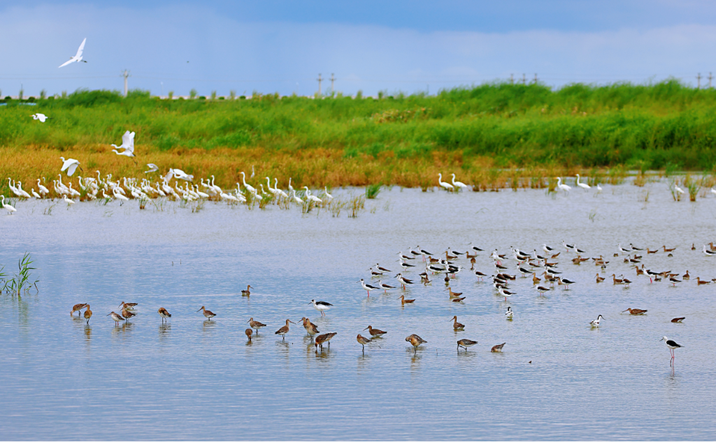 候鸟在浙江省龙港市滨海湿地“休整”、觅食。新华网发 方明和摄