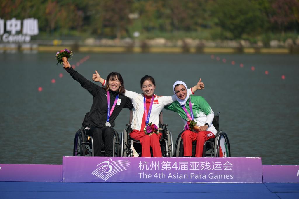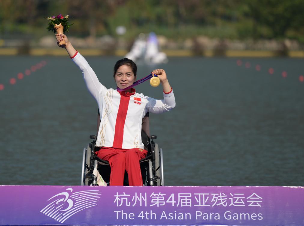 23日上午,在碧波荡漾的富春江上,中国选手谢毛三上演着水上“速度与激情”,她以55秒478的成绩夺得杭州第4届亚洲残疾人运动会皮划艇女子KL1级冠军,这是杭州亚残运会的首枚金牌。