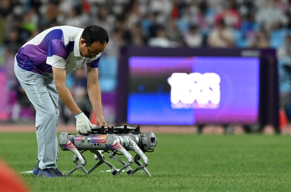 10月1日,在杭州亚运会田径女子铁饼决赛前,一名工作人员将铁饼放在用来搬运铁饼的机器狗上。新华社记者江汉摄