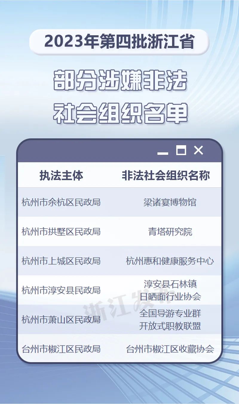 为提高公众防范意识,充分发挥社会监督作用,浙江省民政厅近日公布2023年第四批部分涉嫌非法社会组织名单,请社会公众提高警惕,谨防受骗上当。