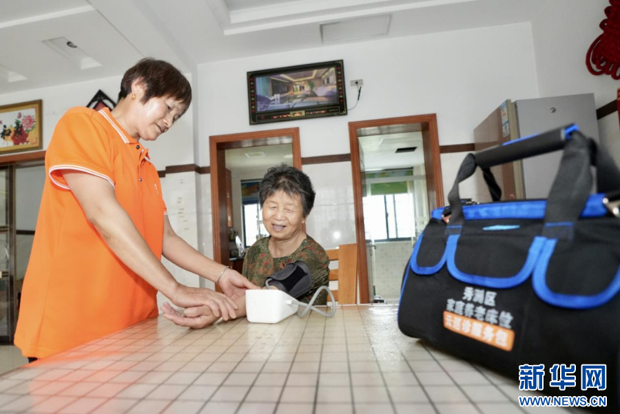 嘉兴市秀洲区王店镇镇西村居家养老服务中心护理员高春妹为镇西村村民姚彩英提供量血压居家养老服务。新华网发 嘉兴市秀洲区传媒中心供图