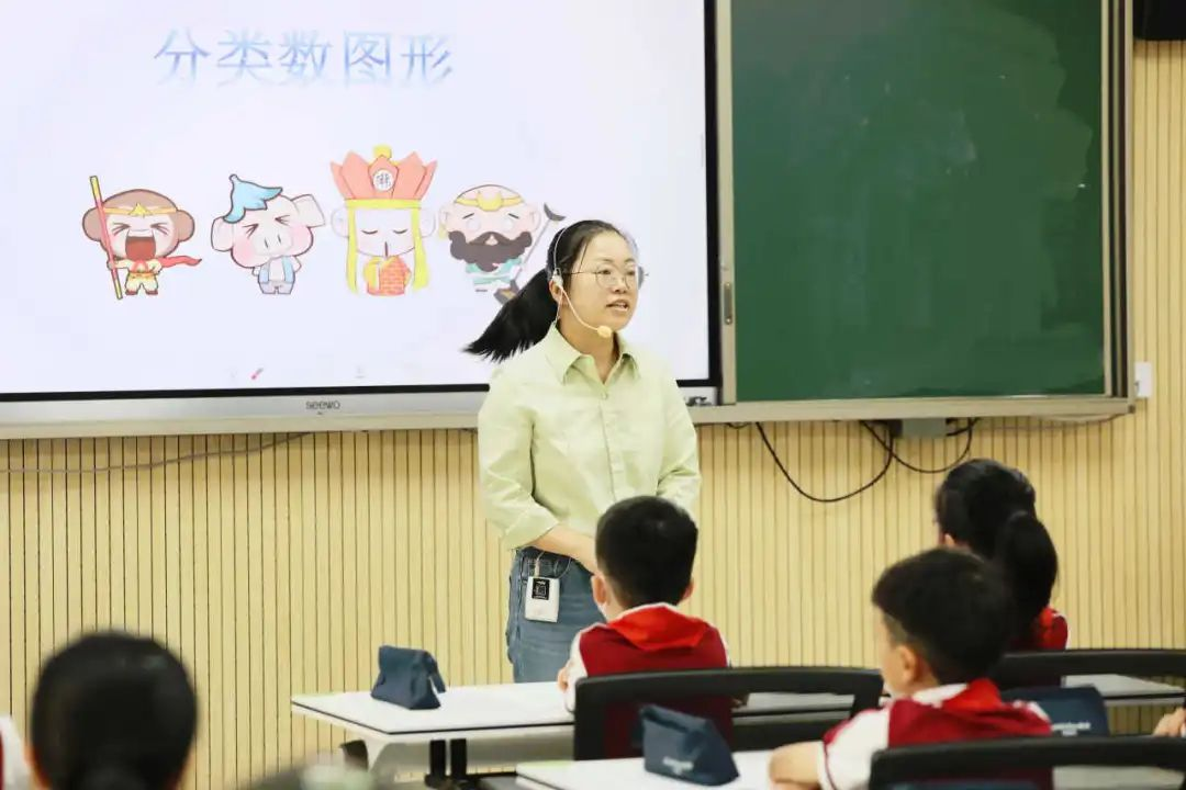 课堂上,江寺小学老师金忠萍巧设西游记唐僧师徒去数学王国的情景,并以师徒四人贯串整节课,教课堂设计体现阶梯性,带着学生不停地探索数学的奥秘;老师胡亚萍循序渐近,用扑克牌表示年龄引出课题,引领学生重在体验、感悟,建立用字母可以表示数量与数量关系的直观表象。